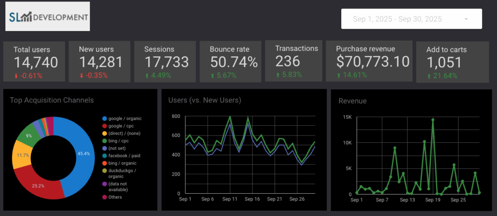 SL Development will help establish a consistent reporting process with standardized conversion metrics. A process to monitor performance for natural and paid traffic streams. Expect transparent reporting and a meaningful analysis. Data is presented to you in regularly scheduled reviews. Continued improvement and success are enabled by comprehensive reporting that measure the effectiveness of your campaigns or tests.
